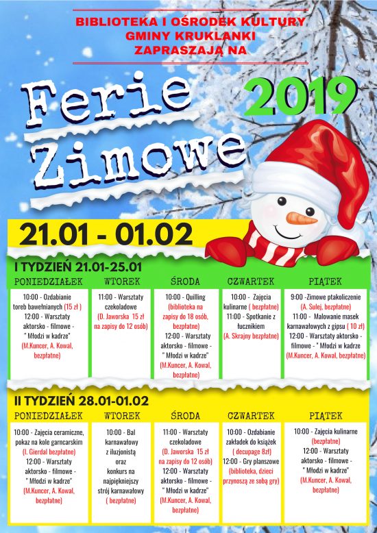 Nadchodzi czas FERII ZIMOWYCH! Serdecznie zapraszamy i zachęcamy wszystkie dzieci i młodzież z naszej gminy do udziału w FERIACH ZIMOWYCH 2019. Przygotowaliśmy specjalnie dla WAS różnorodne i ciekawe propozycje zajęć m.in. warsztaty z czekolady, warsztaty aktorsko-filmowe, quilling, malowanie toreb, bal karnawałowy, a to nie wszystko!