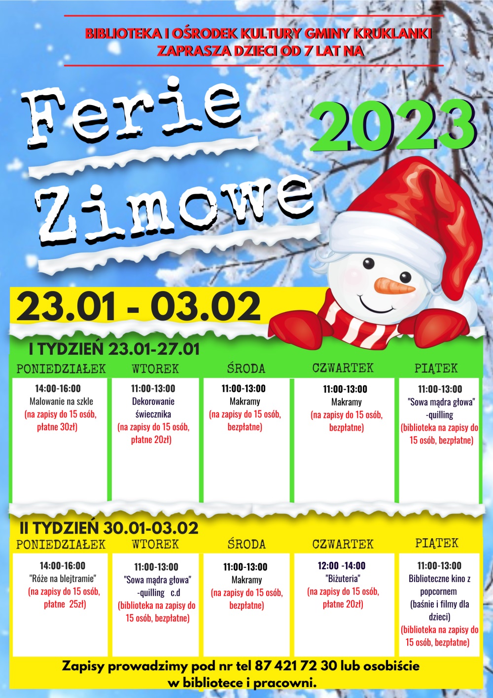 Zapraszamy na wspólne spędzanie Ferii Zimowych w Bibliotece i Ośrodku Kultury Gminy Kruklanki. Szczegółowy plan zajęć na plakacie. Wszystkie zajęcia są na zapisy pod nr tel. 87 421 72 30 lub osobiście w naszej placówce.