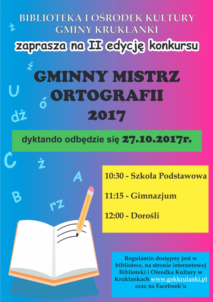 Serdecznie zapraszamy do udziału w konkursie "Gminny Mistrz Ortografii 2017". Dyktando odbędzie się 27.10.2017: