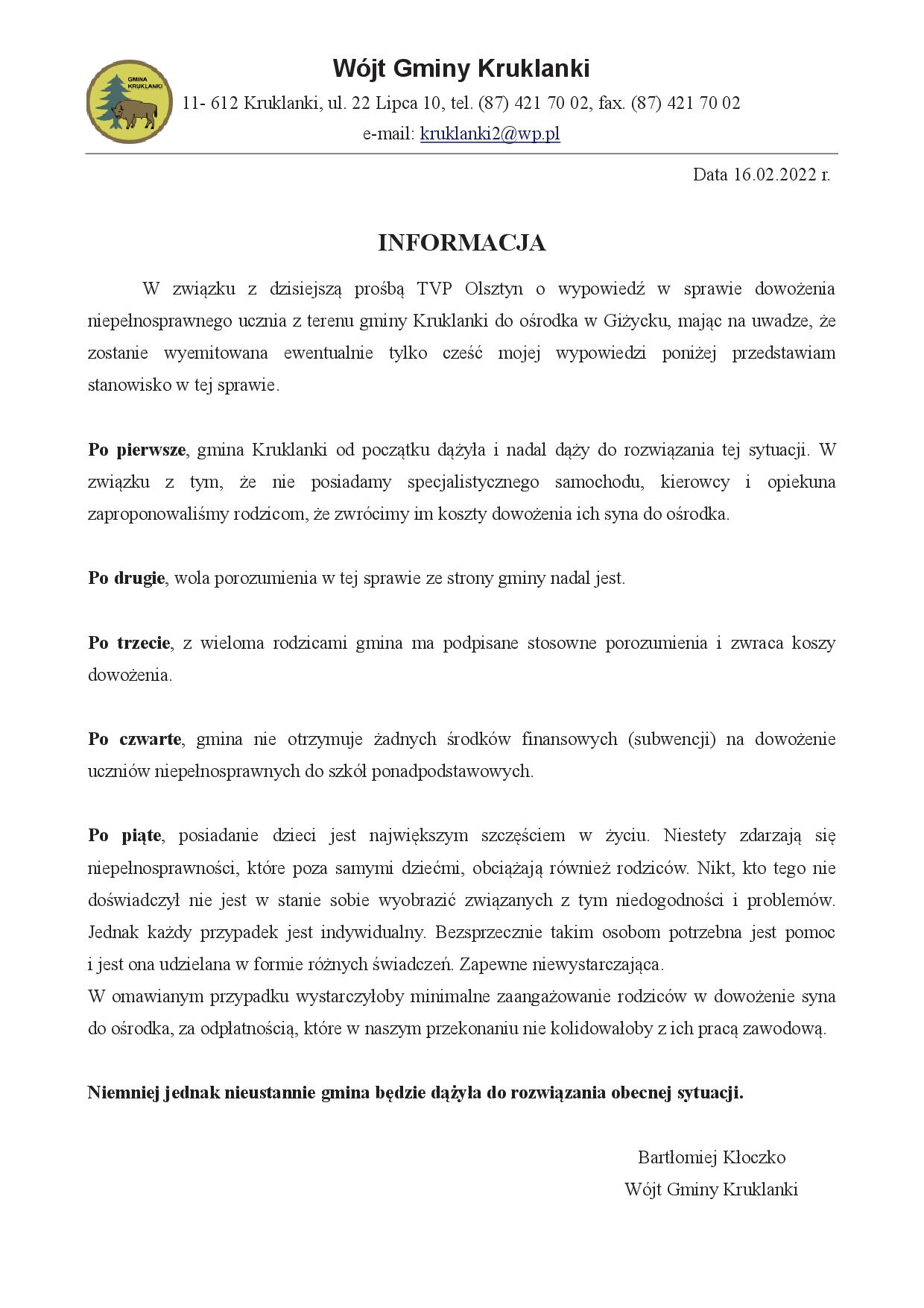 W związku z dzisiejszą prośbą TVP Olsztyn o wypowiedź w sprawie dowożenia niepełnosprawnego ucznia z terenu gminy Kruklanki do ośrodka w Giżycku, mając na uwadze, że zostanie wyemitowana ewentualnie tylko cześć mojej wypowiedzi poniżej przedstawiam stanowisko w tej sprawie.