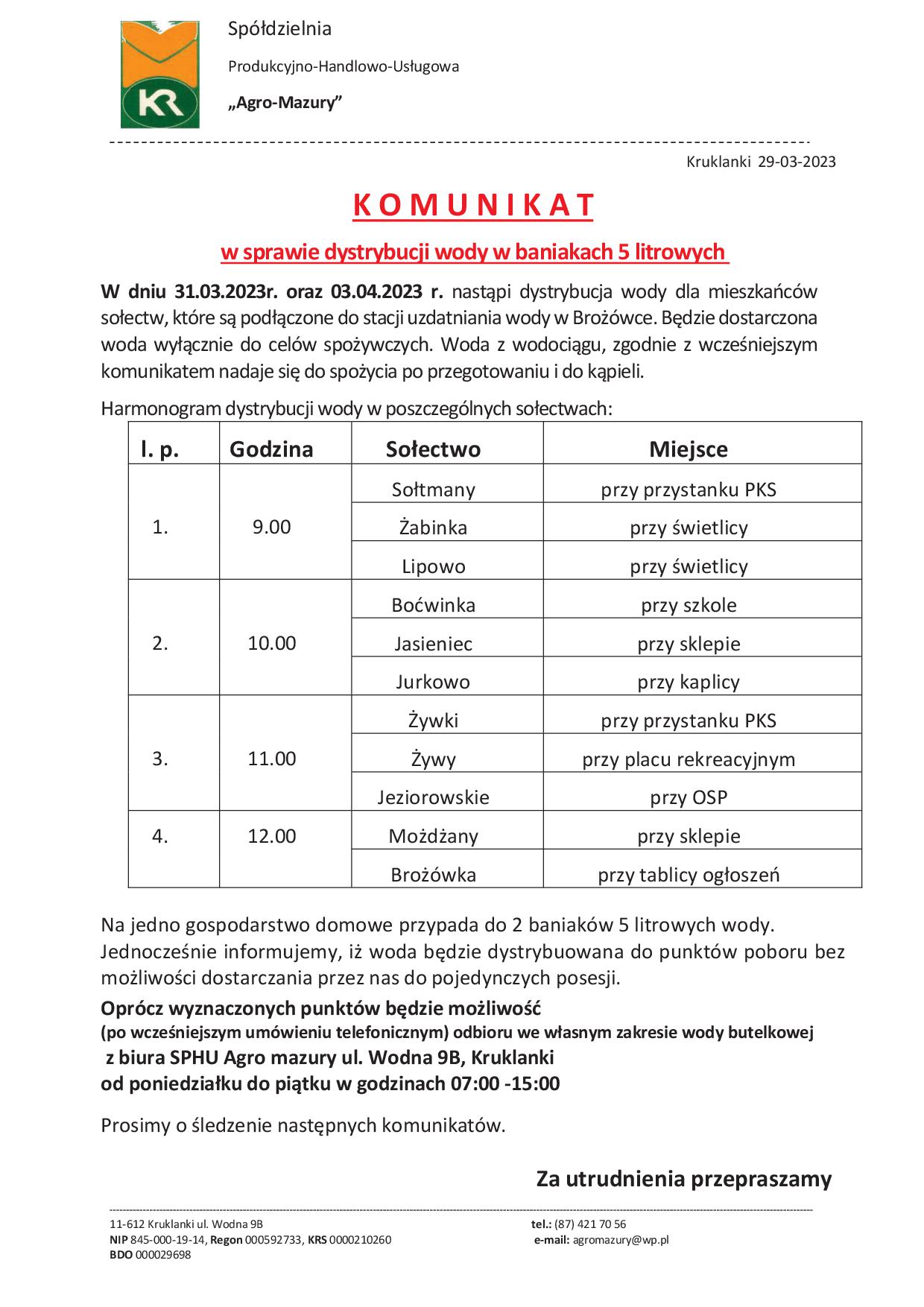 W dniu 31.03.2023r. oraz 03.04.2023 r. nastąpi dystrybucja wody dla mieszkańców sołectw, które są podłączone do stacji uzdatniania wody w Brożówce. Będzie dostarczona woda wyłącznie do celów spożywczych. Woda z wodociągu, zgodnie z wcześniejszym komunikatem nadaje się do spożycia po przegotowaniu i do kąpieli.