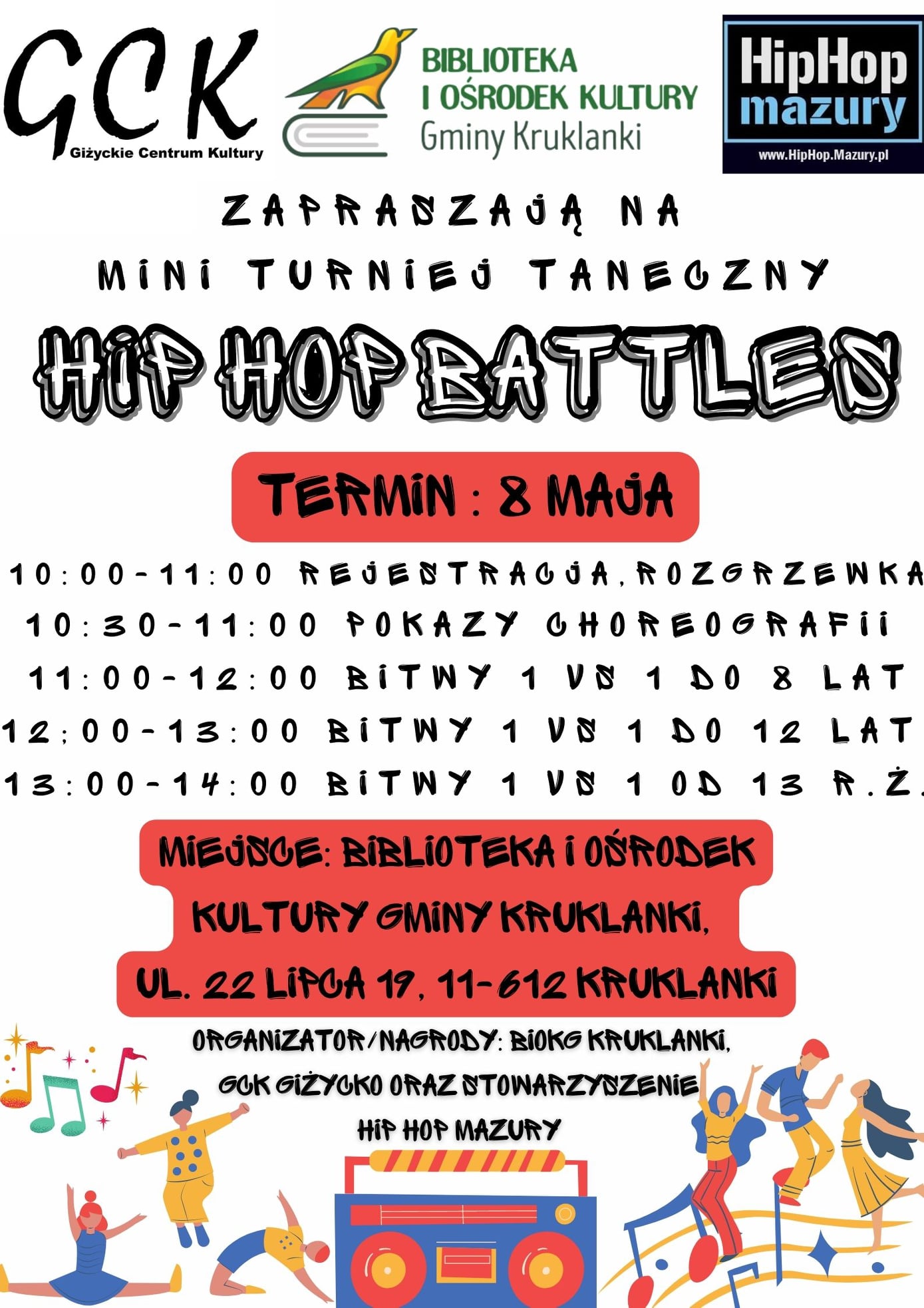 Biblioteka i Ośrodek Kultury Gminy Kruklanki, Giżyckie Centrum Kultury oraz Stowarzyszenie Hip Hop Mazury zapraszają na mini turniej taneczny Hip Hop Battles, podczas którego odbędą się zmagania taneczne w formie bitew tanecznych 1 vs 1 w kategorii Hip Hop Dance oraz pokazy choreografii zespołów z BiOKG Kruklanki, Giżyckiego Centrum Kultury oraz Ełckiego Centrum Kultury, gdzie na scenie zaprezentują się grupy : Street Souls Crew, HipHopki TipTopki, Harmiderki, Jumping Angels, Harmider Crew, Red Devil’s oraz New Level Squad.