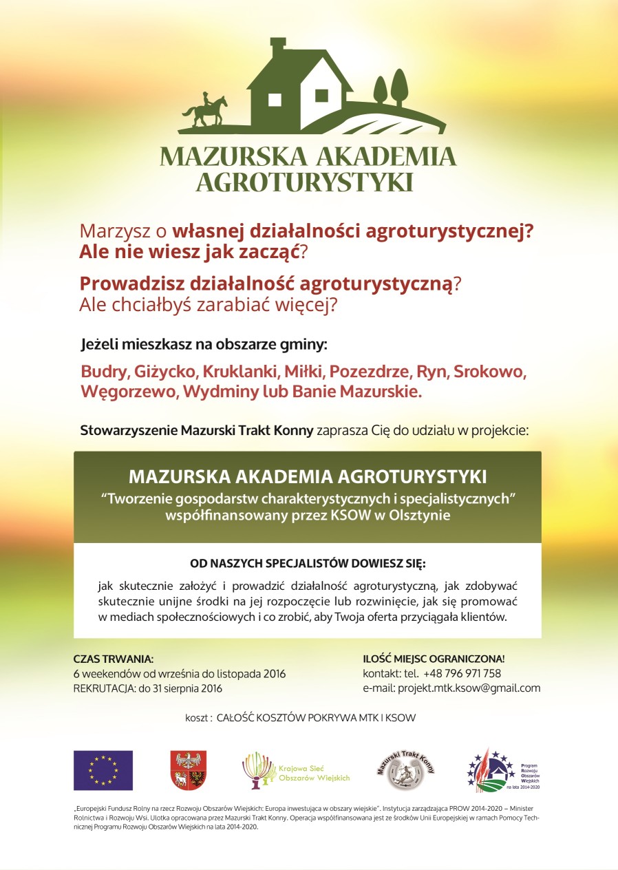 W programie cykl bezpłatnych szkoleń z zakresu agroturystyki, przedsiębiorczości ukierunkowanej na potrzeby turystów (usługi noclegowe, gastronomiczne, rzemiosło, tworzenie gospodarstw i usług charakterystycznych i specjalistycznych) z terenów gmin: Budry, Giżycko, Kruklanki, Miłki, Pozezdrze, Ryn, Srokowo, Węgorzewo, Wydminy oraz Banie Mazurskie. W spotkaniach udział mogą brać właściciele gospodarstw rolnych (w tym agroturystycznych) i ich domownicy. Termin realizacji: 1 sierpnia - 30 listopada br.