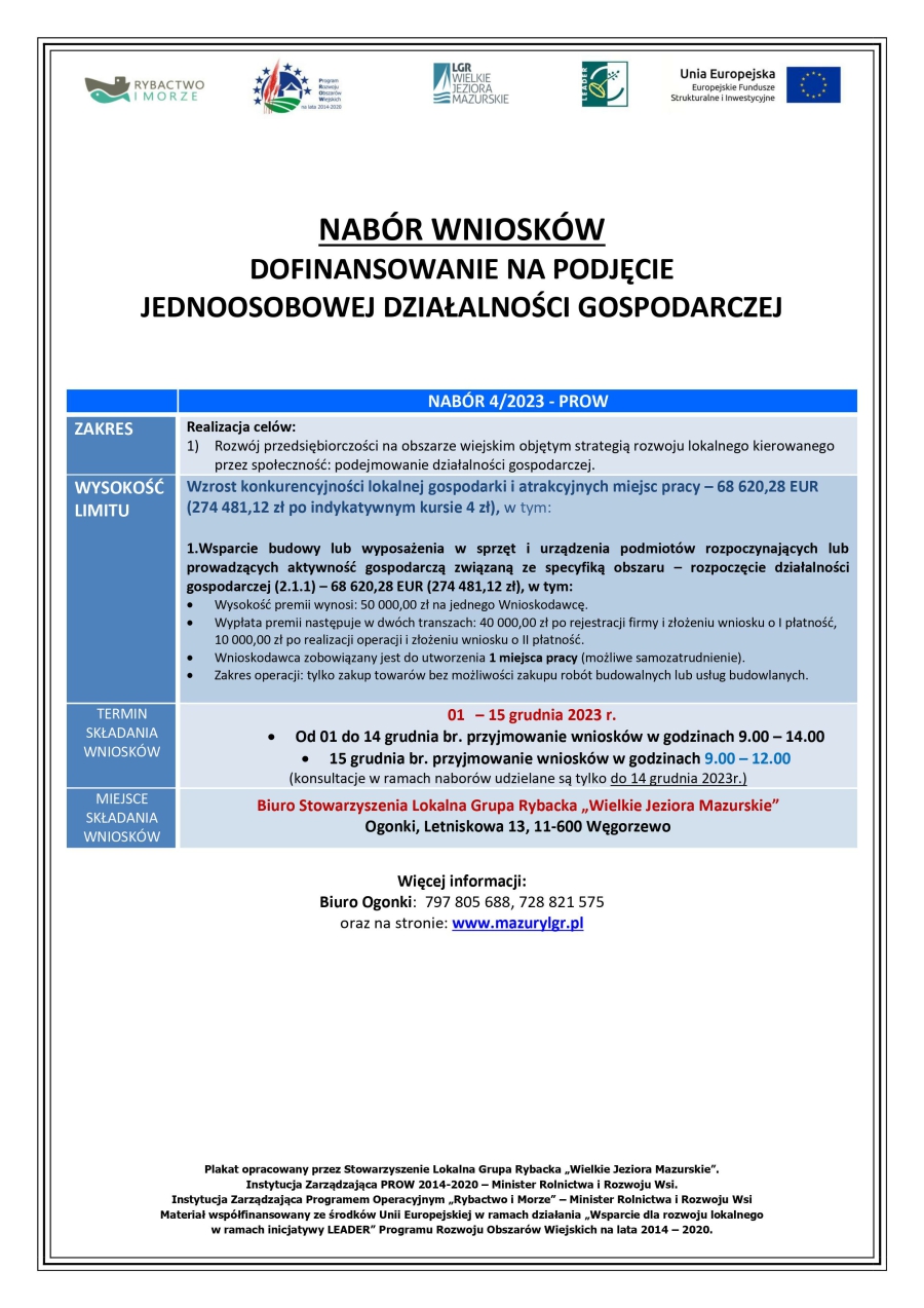 Wnioski o przyznanie pomocy wraz z załącznikami składać należy bezpośrednio (osobiście, przez pełnomocnika albo osobę upoważnioną) w Biurze Stowarzyszenia Lokalna Grupa Rybacka „Wielkie Jeziora Mazurskie”, 11- 600 Węgorzewo, Ogonki, ul. Letniskowa 13, w dni robocze od poniedziałku do piątku w godzinach od 09:00 do 14:00 w terminie od 01 do 15 grudnia 2023r., przy czym ostateczny termin składania wniosków w ramach konkursu upływa 15 grudnia 2023r. o godz. 12.00. Decyduje data wpływu wniosku do Biura Stowarzyszenia Lokalna Grupa Rybacka „Wielkie Jeziora Mazurskie”.