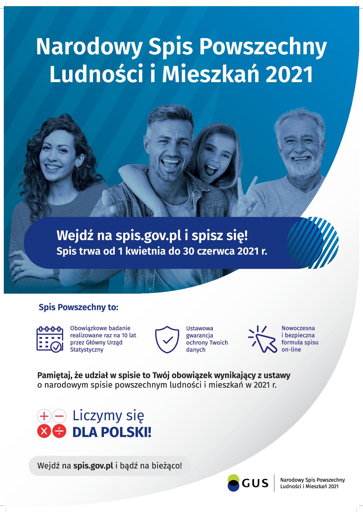 Narodowy Spis Powszechny Ludności i Mieszkań 2021 rozpocznie się na terenie całej Polski od 1 kwietnia 2021 r., według stanu na dzień 31 marca 2021 r., godz. 24:00. Udział w spisie jest obowiązkowy.