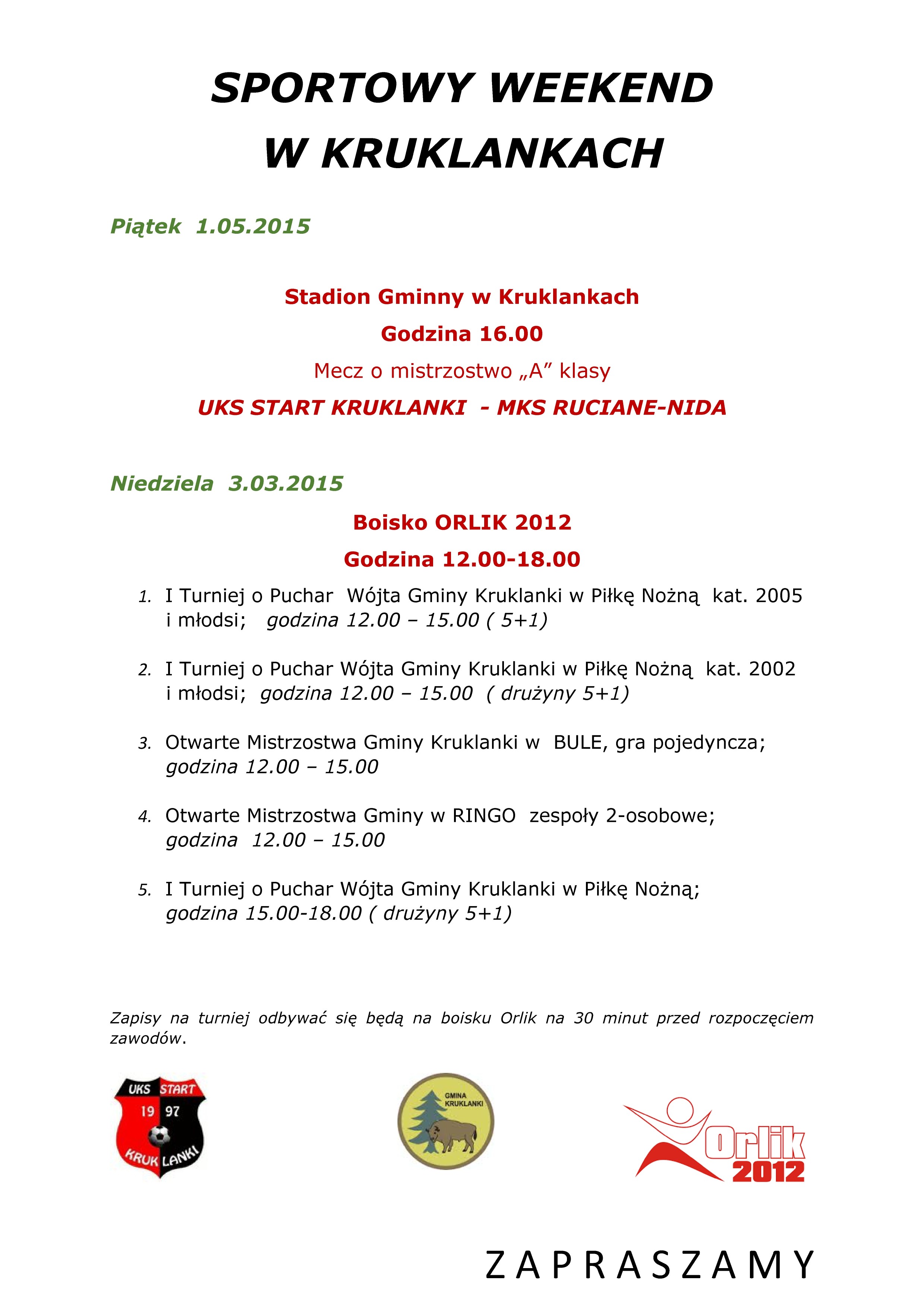 - I Turniej o Puchar Wójta Gminy Kruklanki w Piłkę Nożną kat. 2005 i młodsi; godzina 12.00 – 15.00 ( 5+1)