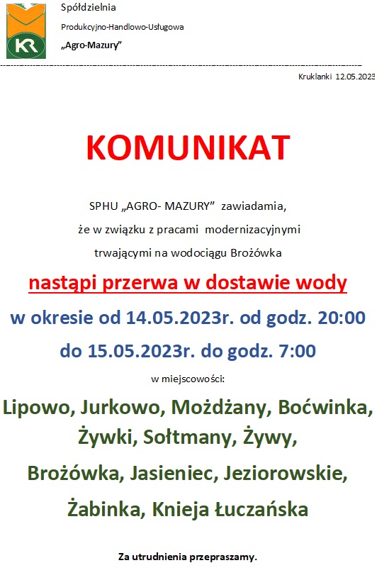 Przerwa w dostawie wody w dniach 14 - 15.05.2023 r.