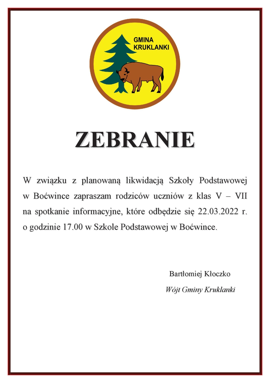 W związku z planowaną likwidacją Szkoły Podstawowej w Boćwince zapraszam rodziców uczniów z klas V – VII na spotkanie informacyjne, które odbędzie się 22.03.2022 r. o godzinie 17.00 w Szkole Podstawowej w Boćwince.