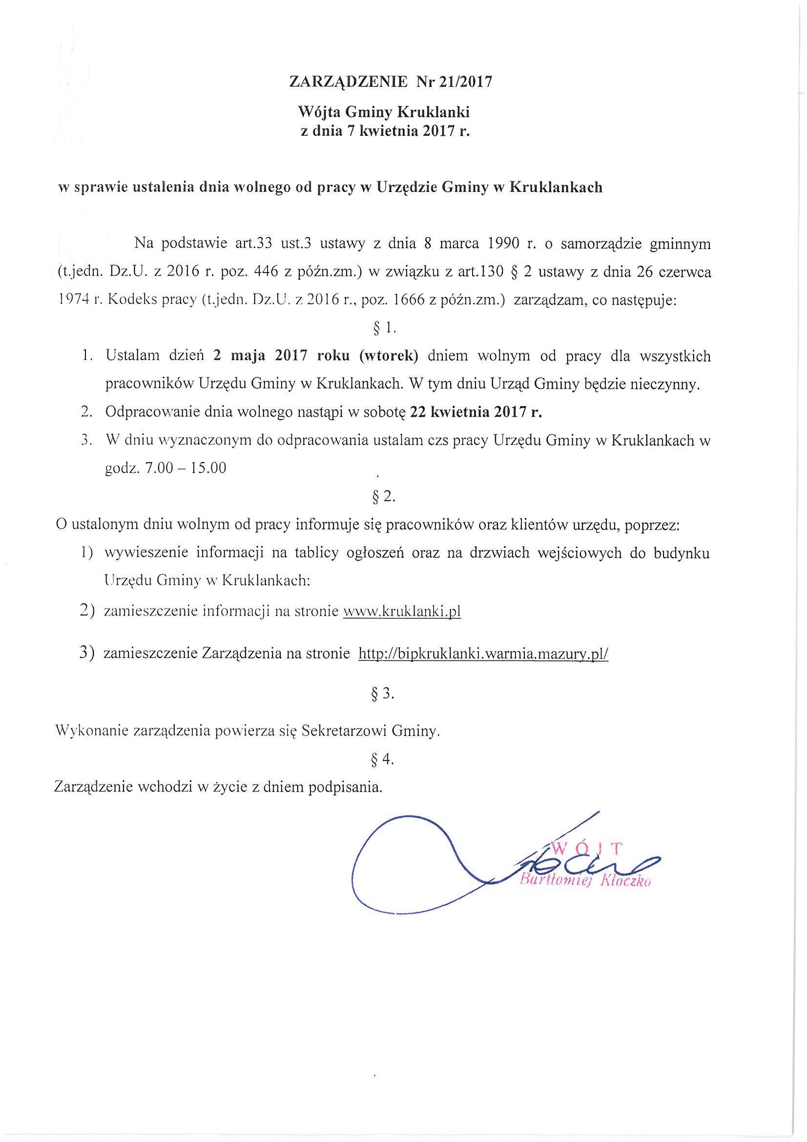 Odpracowanie dnia wolnego nastąpi w sobotę 22 kwietnia 2017r.