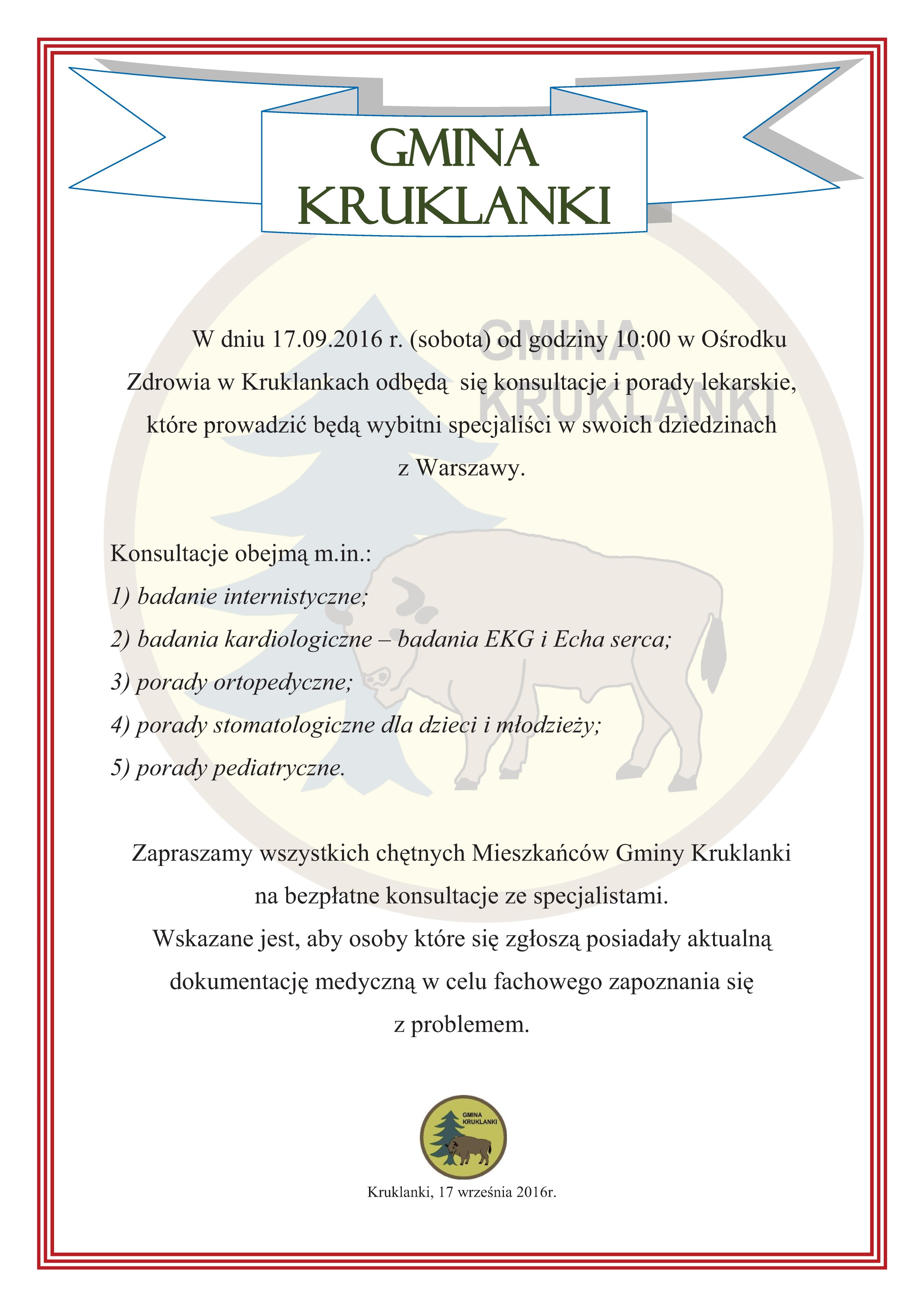 W dniu 17.09.2016 r. (sobota) od godziny 10:00 w Ośrodku Zdrowia w Kruklankach odbędą się konsultacje i porady lekarskie, które prowadzić będą wybitni specjaliści w swoich dziedzinach z Warszawy.