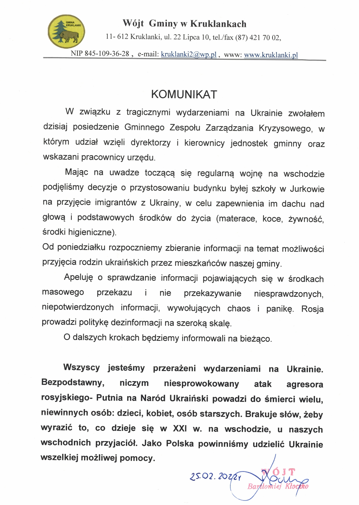 Komunikat Wójta Gminy Kruklanki z dnia 25.02.2022 r.