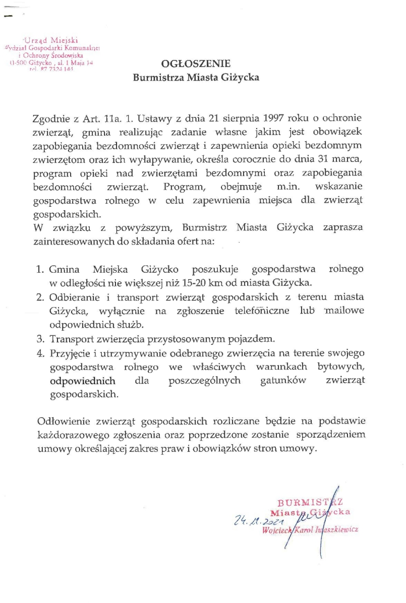 Ogłoszenie Burmistrza Miasta Giżycka