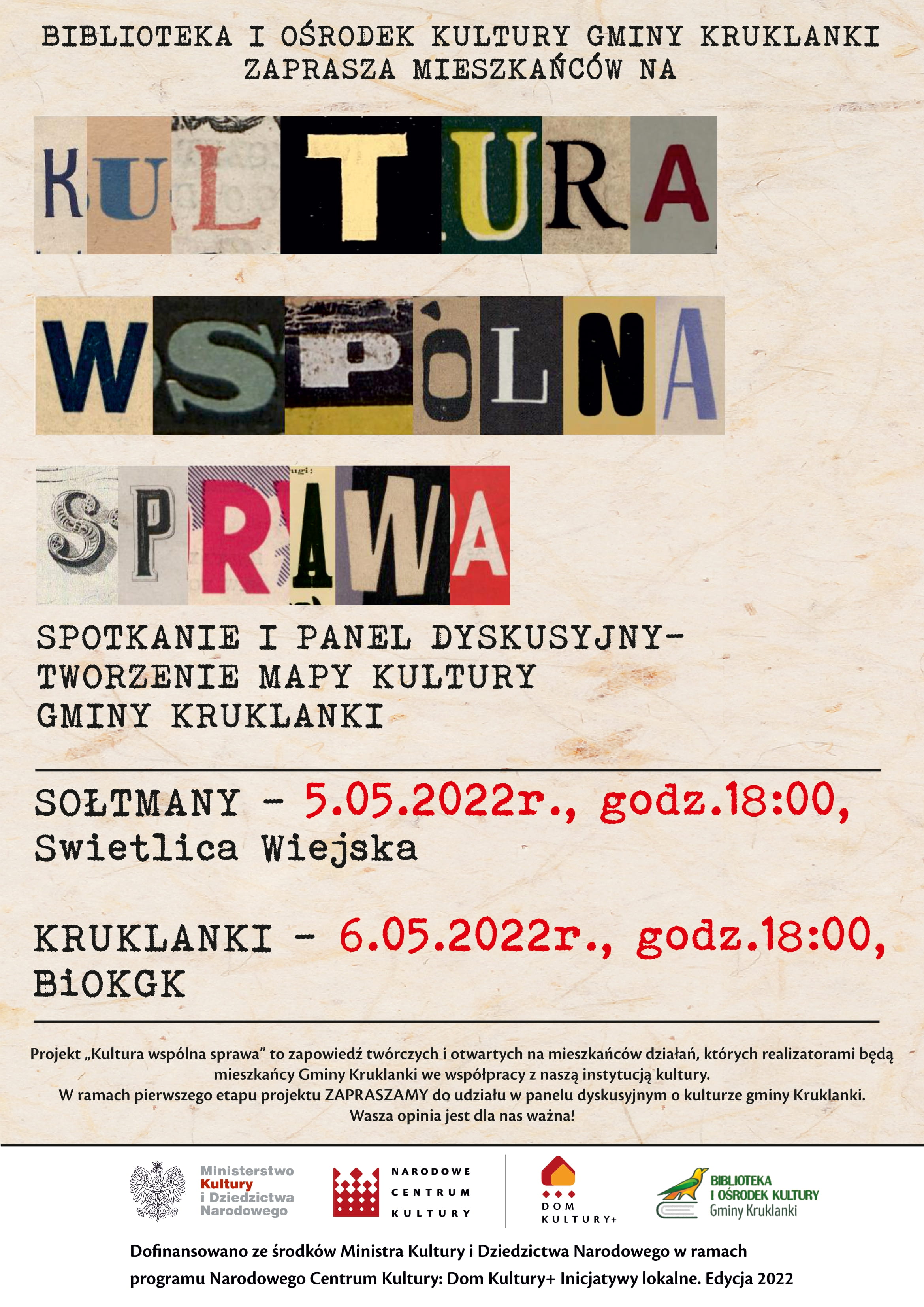 Projekt „Kultura wspólna sprawa” to zapowiedź twórczych i otwartych na mieszkańców działań, których realizatorami będą mieszkańcy Gminy Kruklanki we współpracy z naszą instytucją kultury. W ramach pierwszego etapu projektu zostało zaplanowanych kilka działań, m.in.: spotkania, ankieta, wywiady fokusowe czy tzw. „tablica pomysłów”.