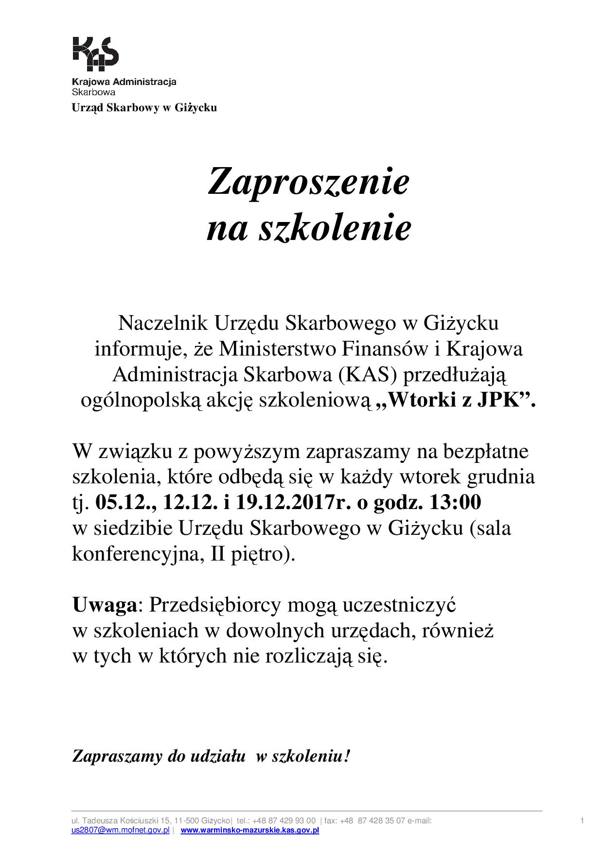 Naczelnik Urzędu Skarbowego w Giżycku informuje, że Ministerstwo Finansów i Krajowa Administracja Skarbowa (KAS) przedłużają ogólnopolską akcję szkoleniową „Wtorki z JPK”.
